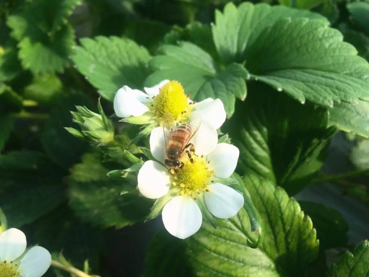 紅顏草莓是由優(yōu)質草莓品種章姬和幸香雜交育成,它繼承了章姬的鮮甜和幸香的耐儲存,也因根基部顏色發(fā)紅得名。一進棚,就聽到陣陣的嗡嗡聲。潔白的草莓花上,小蜜蜂展著透明的翅膀正忙著采蜜。據(jù)說經(jīng)過蜜蜂授粉良好的花朵才能長出個頭飽滿勻稱的草莓。