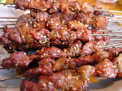 烤約兩分鐘之后,翻面,依次撒芝麻、孜然、再烤一兩分鐘,肉已經(jīng)九分熟時,最后撒上辣椒粉。也有在九分熟時,加糖的,糖能入味,糖化了之后,串亮,顏色漂亮。 烤好出爐之前,串最好反復(fù)擠壓,讓烤出的肉汁與調(diào)料充分融合入味。