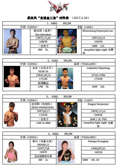 2017年2月10日,武林風(fēng)應(yīng)老撾金三角經(jīng)濟(jì)特區(qū)邀請(qǐng),聯(lián)合WLF世界搏擊理事會(huì)運(yùn)營(yíng)機(jī)構(gòu)、全球高端訂制賽事運(yùn)營(yíng)商,頂級(jí)劇場(chǎng)式搏擊賽事運(yùn)營(yíng)機(jī)構(gòu)——云頂星戰(zhàn),再次走進(jìn)這片神秘的土地。當(dāng)?shù)亟M織了強(qiáng)大的選手陣容嚴(yán)陣以待,包括泰國(guó)、老撾、柬埔寨等東南亞各國(guó)頂尖高手。