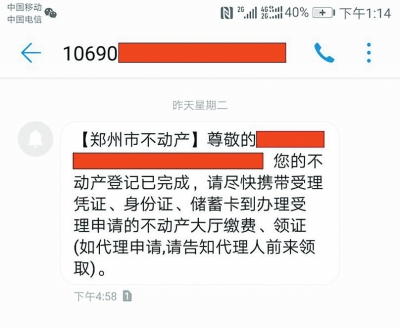 大河報記者了解到,鄭州市不動產(chǎn)登記中心目前正式推出了業(yè)務(wù)辦結(jié)的短信提醒服務(wù)。當(dāng)不動產(chǎn)登記部門在辦結(jié)申請人的相關(guān)申請后,便會給申請人(代理人)發(fā)去短信,提醒其及時前往不動產(chǎn)登記部門領(lǐng)取不動產(chǎn)登記證書、證明?!皬臉I(yè)務(wù)辦結(jié)到領(lǐng)證還有一些內(nèi)部流轉(zhuǎn)程序,一般情況下,我們都是在繕證完成后24小時發(fā)送短信。”相關(guān)負(fù)責(zé)人介紹說。