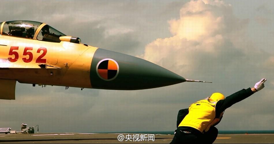 昨天,央視新聞首先在節(jié)目中播出這一視頻。視頻配以恢宏的音樂(lè),記錄了殲15艦載機(jī)在遼寧艦上起飛、著艦的畫(huà)面。視頻以飛行員的日?;居?xùn)練作為開(kāi)頭,描述了飛行員做起飛前的準(zhǔn)備工作、飛行中駕駛飛機(jī)及著陸的狀態(tài)。值得注意的是,視頻中,還有近10秒時(shí)間展示了殲15在空中進(jìn)行特技飛行動(dòng)作的畫(huà)面,飛行員駕駛飛機(jī)進(jìn)行翻轉(zhuǎn),畫(huà)面中天空與地面的位置調(diào)轉(zhuǎn)。