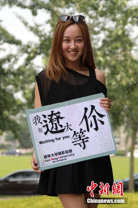 6月23日,美女拿著“我在遼大等你!的牌子在拍照。當(dāng)日, 遼寧大學(xué)攝影協(xié)會推出一組遼大創(chuàng)意“招生名片”照片,在網(wǎng)絡(luò)爆紅出鏡的數(shù)位帥哥靚妹抓人眼球。中新社發(fā) 于海洋 攝