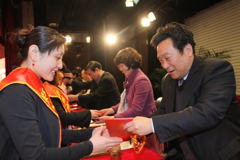 市人大副主任、市總工會主席李元法向受表彰女職工頒獎(jiǎng)